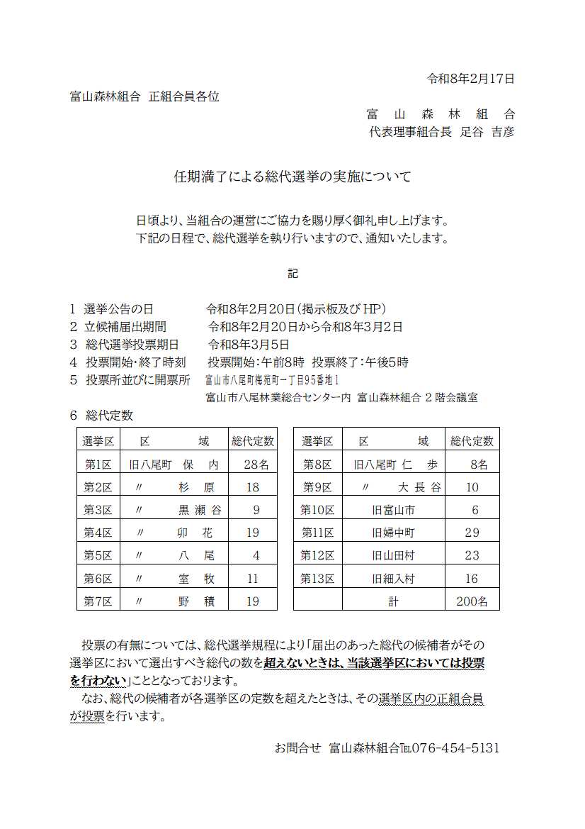 令和8年2月17日 富山森林組合 正組合員各位 富 山 森 林 組 合 代表理事組合長 足谷吉彦 富山森林組合総代選挙のお知らせ 富山森林組合総代の任期満了に伴う総代選挙を下記の通り執行いたします。 立候補される正組合員は、下記の事項をご確認のうえ、立候補届のお手続きをお願いいたします。 なお、立候補者が定数以内の場合は投票を行わない旨を申し添えます。 記 〇 選挙する総代数 200名 〇 選挙の公告 令和8年2月20日(金) 〇 立候補受付期間 令和8年2月20日(金)から3月2日(月)まで 〇 選挙の期日 令和8年3月5日(木) 午前8時から午後5時まで ※立候補が定数以内の場合は、投票を行わない公告をします 〇 投票所並びに開票所 富山市八尾町梅苑町一丁目95番地1(富山市八尾林業総合センター内) 富山森林組合 2階会議室 〇 各地区総代定数 選挙区 区 域 総代定数 第1区 旧八尾町 保 内 28名 第2区 旧八尾町 杉 原 18名 第3区 旧八尾町 黒瀬谷 9名 第4区 旧八尾町 卯 花 19名 第5区 旧八尾町 八 尾 4名 第6区 旧八尾町 室 牧 11名 第7区 旧八尾町 野 積 19名 第8区 旧八尾町 仁 歩 8名 第9区 旧八尾町 大長谷 10名 第10区 旧富山市 6名 第11区 旧婦中町 29名 第12区 旧山田村 23名 第13区 旧細入村 16名 計 200名 〇 注意事項 正組合員でない方は、自ら総代に立候補し、また総代の候補者を推薦することができませんのでご注意ください。 【お問合せ先】富山森林組合 総務指導課 ℡ (076)454-5131